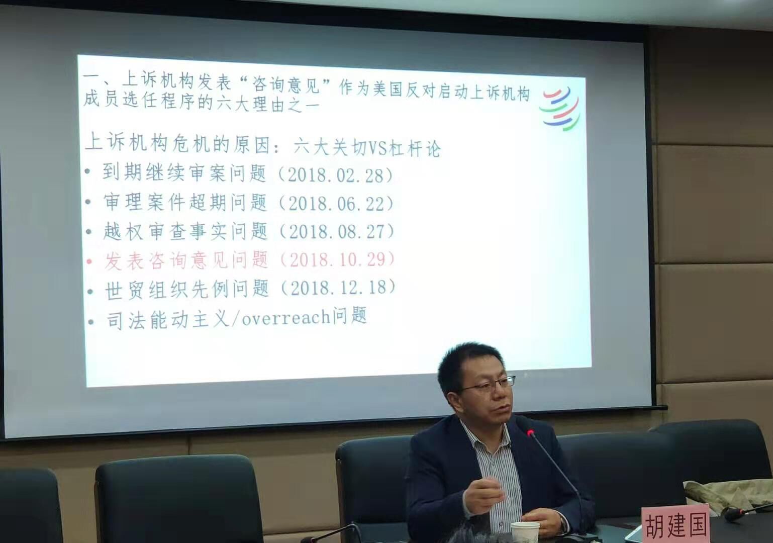 2019年10月26日,南开大学太阳成集团tyc234cc胡建国教授应邀来太阳成集团tyc234cc作了题为“WTO上诉机构发表咨询意见‘否定论’”的学术报告,报告地点在模拟法庭三楼会议室。,学院共有60余名研究生参加。
