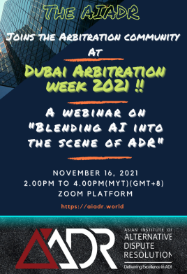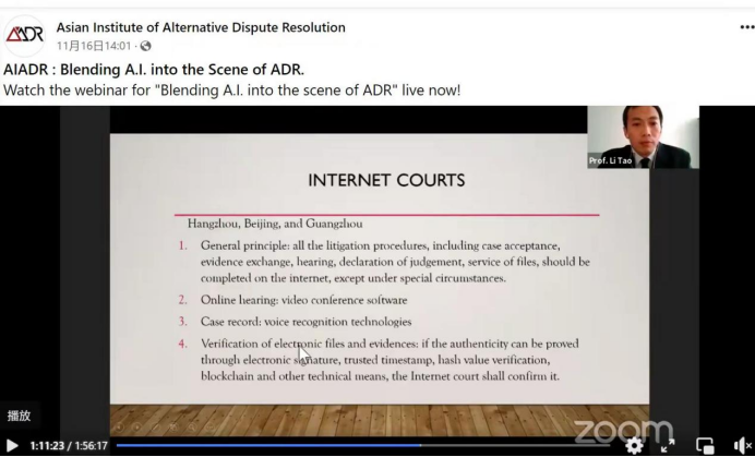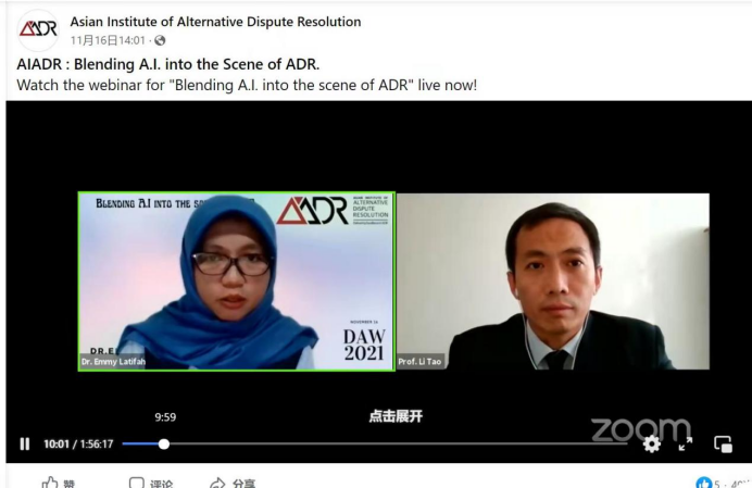 11月16日下午两点,太阳成集团tyc234cc李涛教授受国际组织——亚洲多元争议解决研究院(AIADR)的邀请参加由迪拜仲裁社区,迪拜国际金融中心仲裁协会(DIFC-LCIA)组织的2021迪拜仲裁周的主题研讨会。研讨会通过zoom会议的形式进行,主题为“将人工智能融入到多元争议解决的场景”。