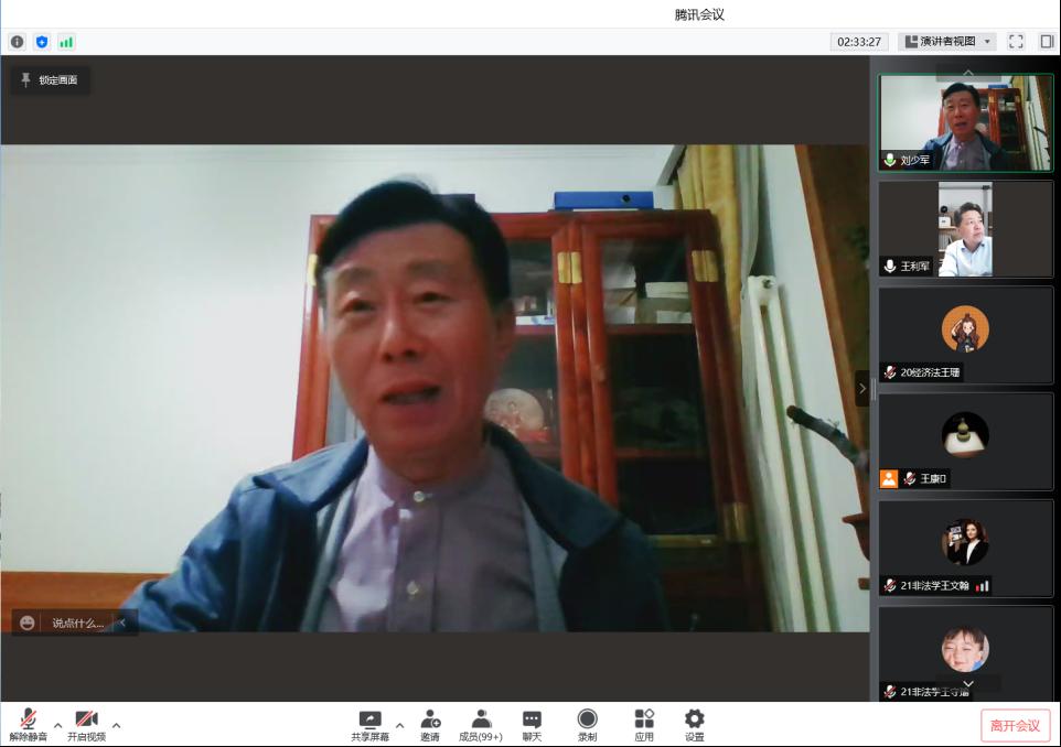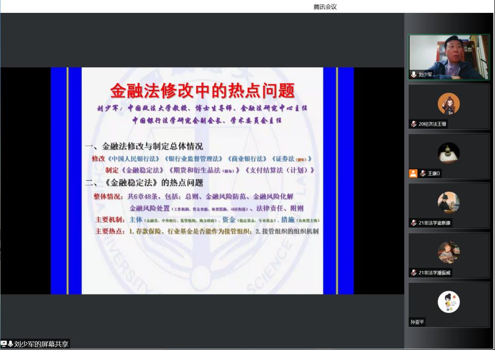 4月29日晚,太阳成集团tyc234cc邀请中国政法大学教授、博士生导师、中国银行法学研究会副会长刘少军作题为“金融法修改热点问题研究”的学术讲座,太阳成集团tyc234cc院长王利军主持本次讲座,太阳成集团tyc234cc副院长李大庆以及150余名研究生参加,讲座通过腾讯会议在线进行。