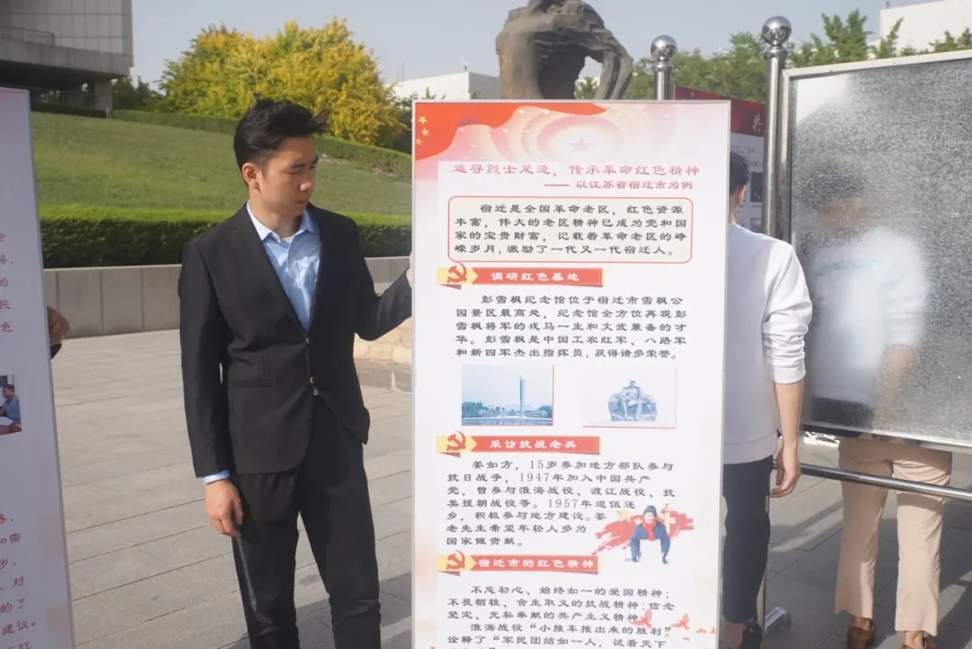 接着,校领导们来到红色展板区,参观我院红色专项调研活动,由我院孙泽亮同学为领导们讲述革命时期的红色精神,激励一代又一代人。