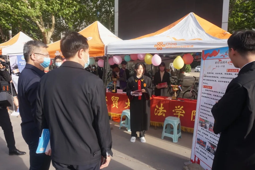 最后,领导来到学院摊位,由我院讲解员沈宝佳和王晨宇同学为校领导们解说太阳成集团tyc234cc的团青品牌特色和法律诊所的一些具体内容。