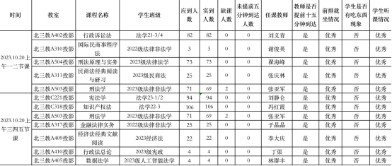 教学运行总体情况良好。检查组安排21名工作人员分别到各个教室,对10月20日上午的教学情况进行了全面检查,共检查12个教学班。教师们提前十五分钟到达教室并打开课件,整体课堂氛围活跃。同学们按时提前到达教室,认真听讲并思考课堂知识,与老师积极互动,及时记录课堂笔记,课堂纪律优秀,无在教室吃东西以及迟到现象。