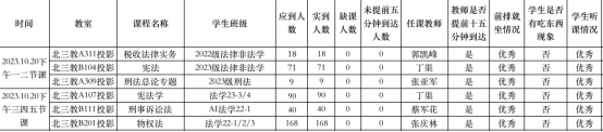 教学运行总体情况良好。检查组安排12名工作人员分别到各个教室,对10月20日下午的上课情况进行了全面检查,共检查6个教学班。教师们整体课程思路清晰,课程的重难点突出,设计饱满合理。各个班级的学生们提前到达教室,认真听课,积极前排就座,主动回答问题,与老师互动,没有出现学生在教室吃东西的现象,学生听课状态优秀。