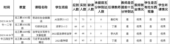 教学运行总体情况良好。检查组安排8名工作人员分别到各个教室,对10月26日下午的上课情况进行了全面检查,共检查4个教学班。教师们提前到达教室,教学着眼于学术前沿和实务相结合,生动质朴,引人入胜。学生们认真听讲,与老师积极互动,及时记录课堂笔记,课堂整体氛围活跃,教学效果优秀。