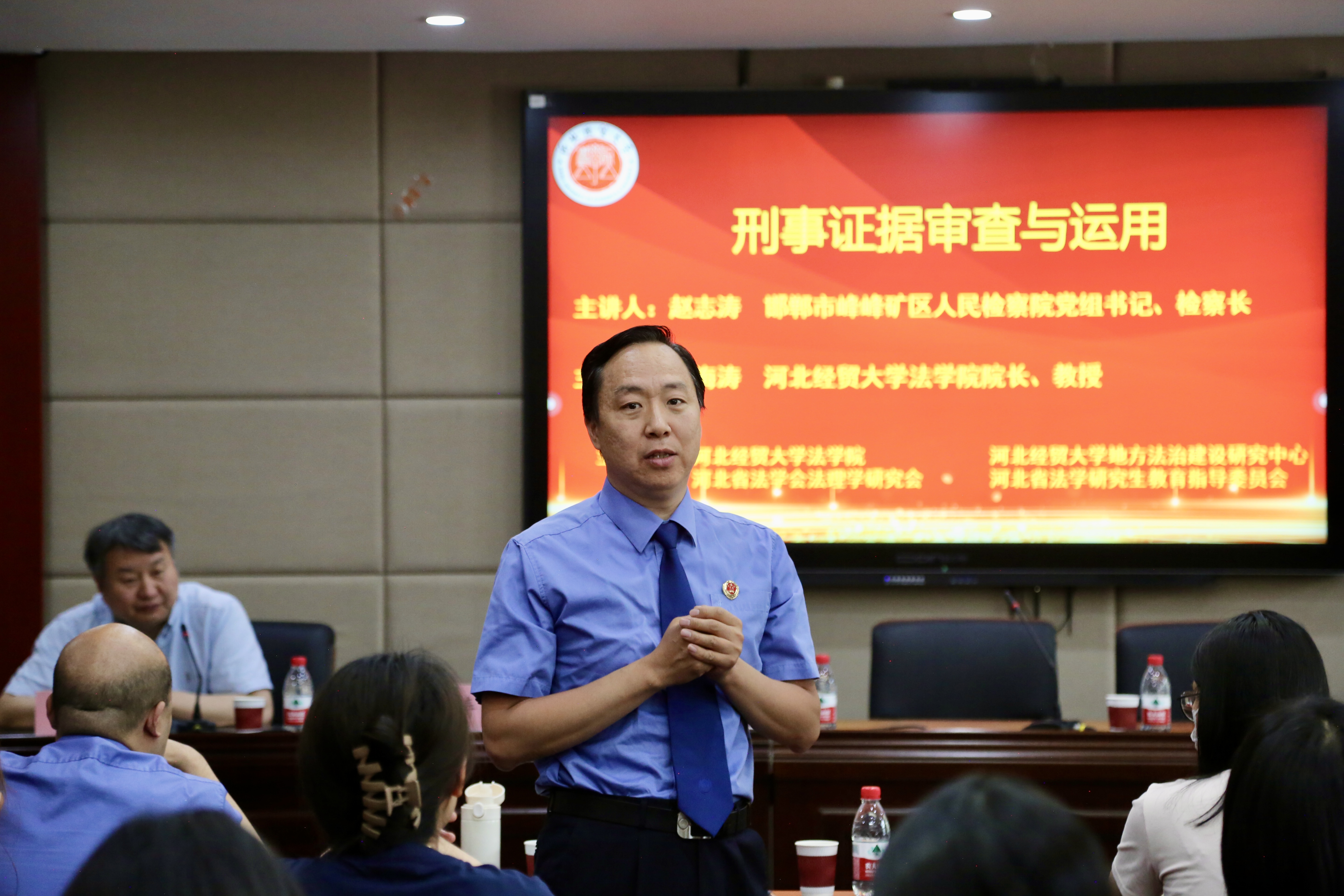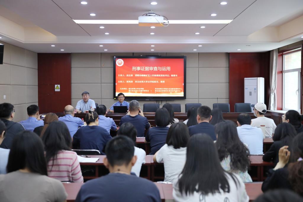 5月26日上午,太阳成集团tyc234cc邀请邯郸市峰峰矿区人民检察院党组书记、检察长,三级高级检察官赵志涛,以“刑事证据审查与运用”为题作学术报告。河北省人民检察院政治部干部教育培训处处长郎大强等领导出席,太阳成集团tyc234cc院长胡海涛主持,60余名师生到场聆听。