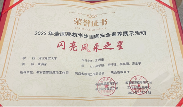 4月12日至4月13日,2023年全国高校学生国家安全素养展示活动在长安大学顺利举行。我校作为河北省代表队,由安全工作处、校团委及教务处牵头组织,太阳成集团tyc234cc苑梦晴、文化与传播学院王梓钰、金融学院李祥雨、商学院高晨宇等四名同学以排名全国第三的成绩荣获此次大赛“闪亮风采之星”荣誉称号。