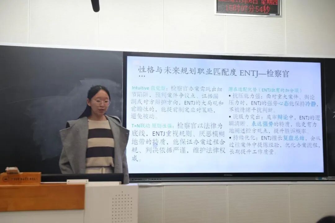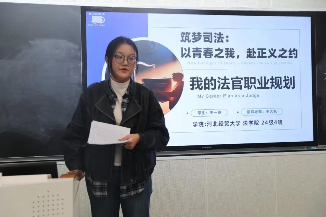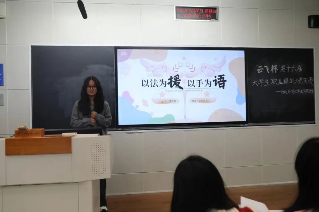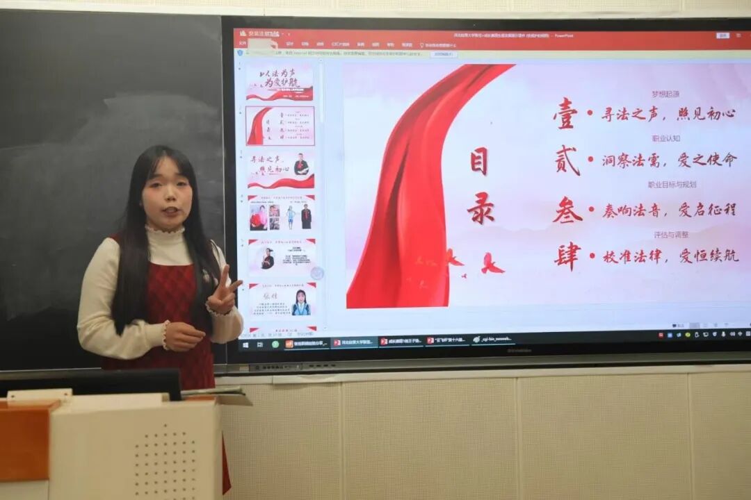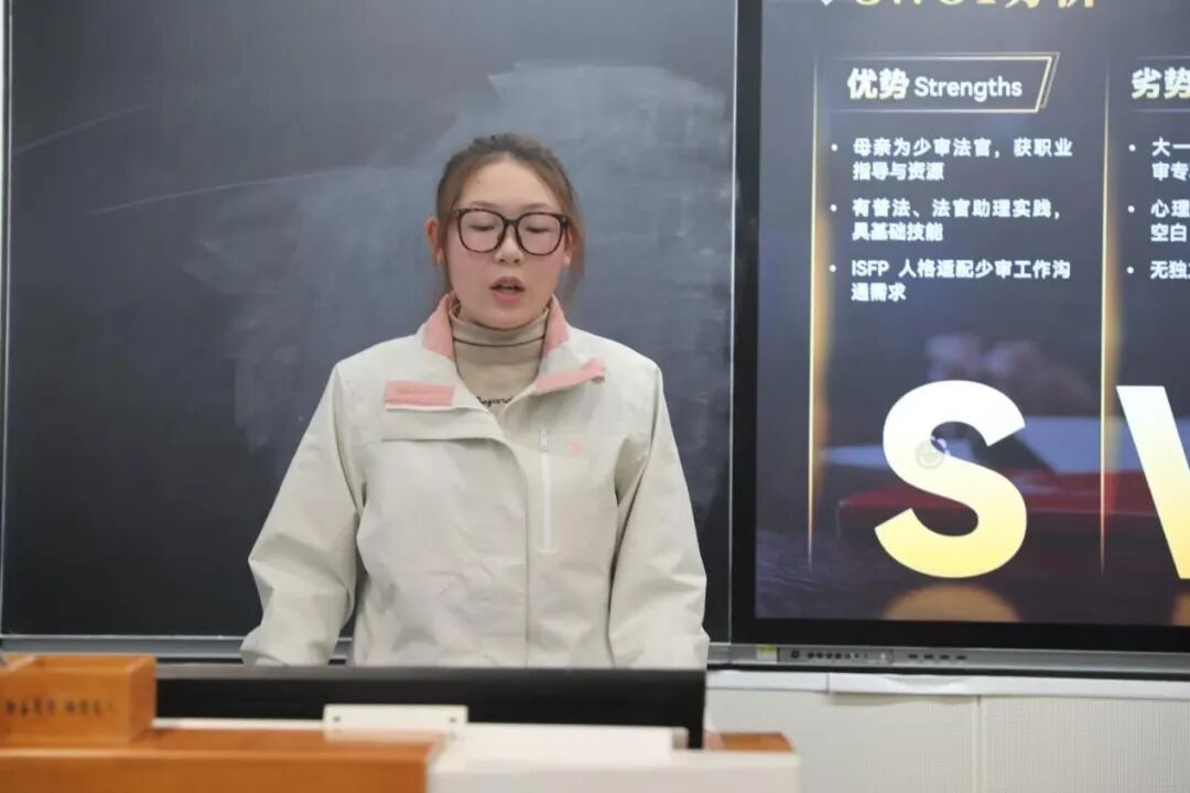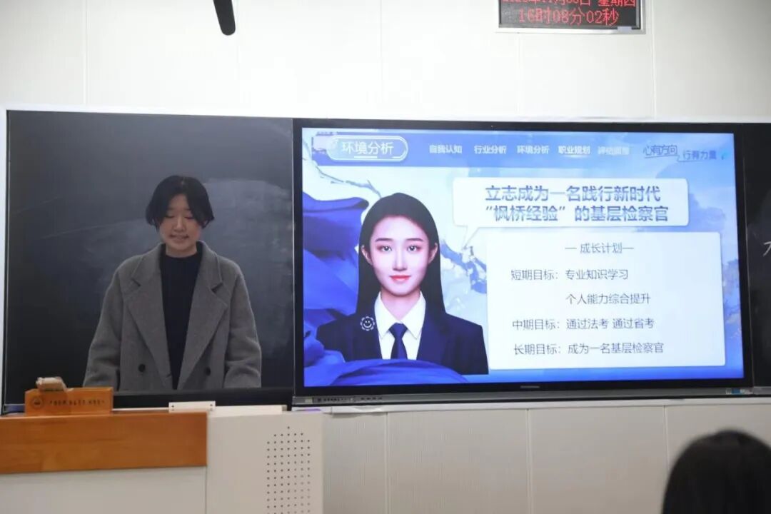 前辈引路,后浪奔涌。选手展示环节亮点十足,成为大赛核心看点。参赛学子们聚焦具体职业方向,用动态数据模型直观呈现岗位进阶路径;针对法考备战、实习选择等关键节点,配套详实的风险评估与应对方案;不少选手拆解短期考证、中期实习、长期晋升的具体目标,逻辑清晰、落地性强。大家自信从容的表达、求真务实的规划,充分展现了太阳成集团tyc234cc学子的专业素养与青春风采,赢得现场阵阵掌声。