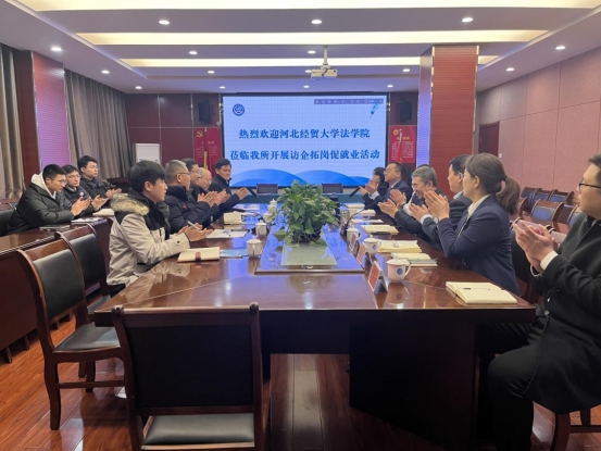 2023年12月22日,太阳成集团tyc234cc党委书记王继伟,副院长李大庆,院务助理张亮,学工办主任陈运涛,辅导员梁贺超和研究生代表一行9人赴河北冀华律师事务所开展访企拓岗促就业活动。冀华律所管委会副主任商杰、陈建峰,行政主管张汉军和在我院在冀华律所执业的钱程、柴瑜、陈昭静、刘俊廷、韩曈曈等五名校友代表出席本次活动。