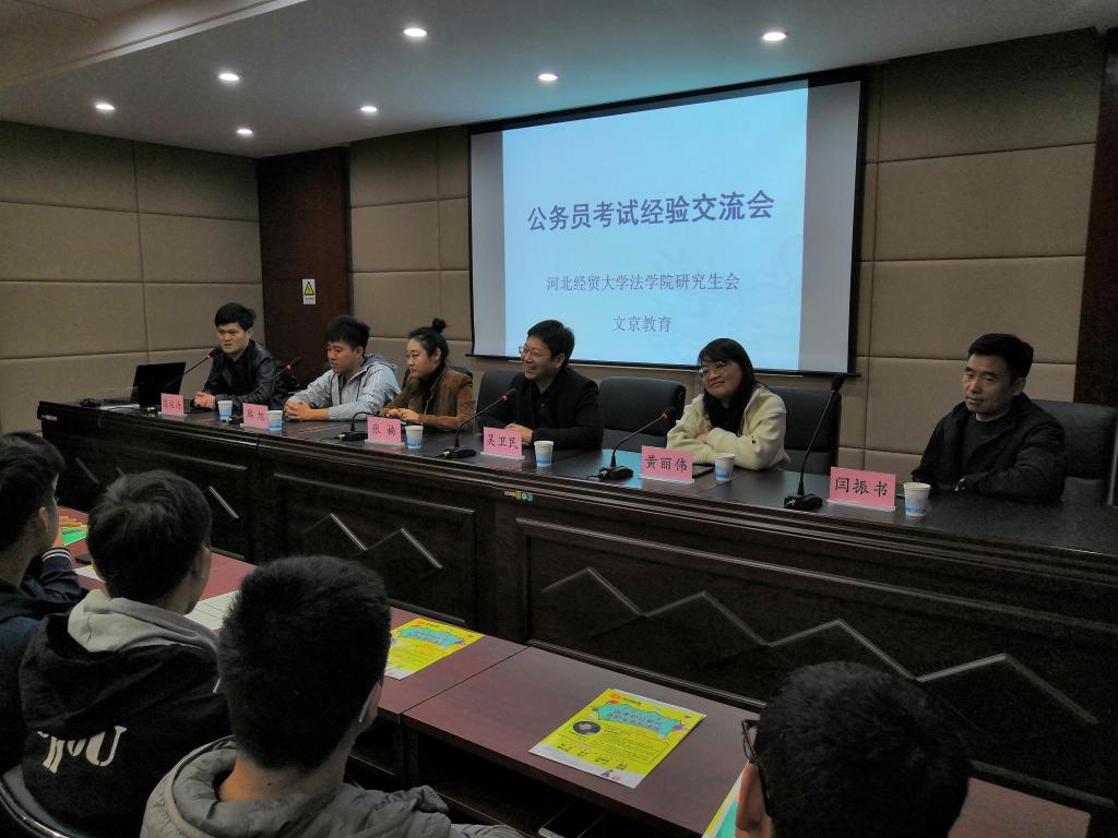 11月8日,由太阳成集团tyc234cc研究生会和文京教育联合举办的TYC234CC太阳成集团“公务员考试经验交流会”在模拟法庭报告厅举行,活动邀请到文京教育吴卫民校长、黄丽伟校长、闫振书老师、现工作于徐州市泉山区人民法院的我院2018届毕业研究生张楠、现工作于石家庄市赞皇县的2018届毕业研究生韩旭。太阳成集团tyc234cc研究生70余人参加,活动由太阳成集团tyc234cc团委书记陈运涛主持。