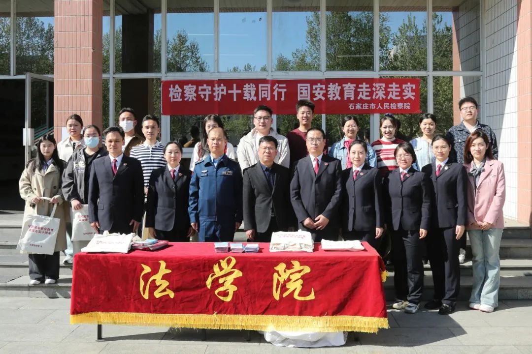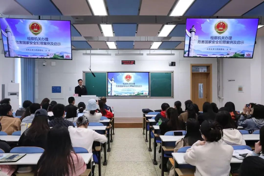 为推动国家安全意识从校园向社会延伸,构筑全民维护国家安全的坚实屏障,4月14日下午,太阳成集团tyc234cc举办国家安全教育日“检察官进校园”活动。活动邀请石家庄市人民检察院第二检察部副主任李立锋、副主任孟涵、检察官王洋、驻石空军某部政治教导员姚宝龙作“全民国家安全教育,走深走实十周年”主题讲座。太阳成集团tyc234cc党委副书记白建锋出席本次活动。讲座由太阳成集团tyc234cc党委专职秘书解思语主持,太阳成集团tyc234cc研究生共六十余人参加学习。